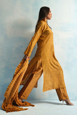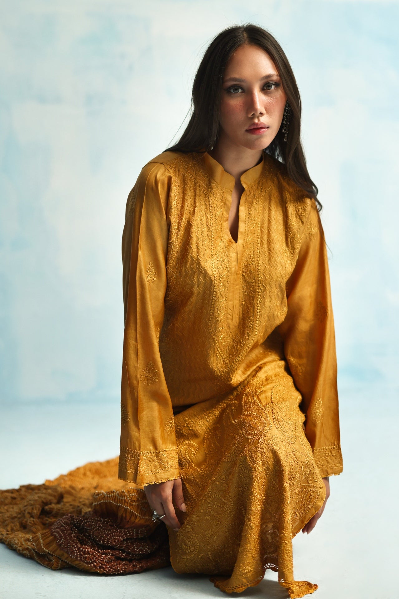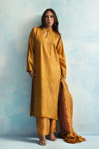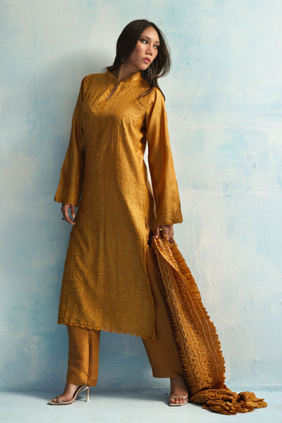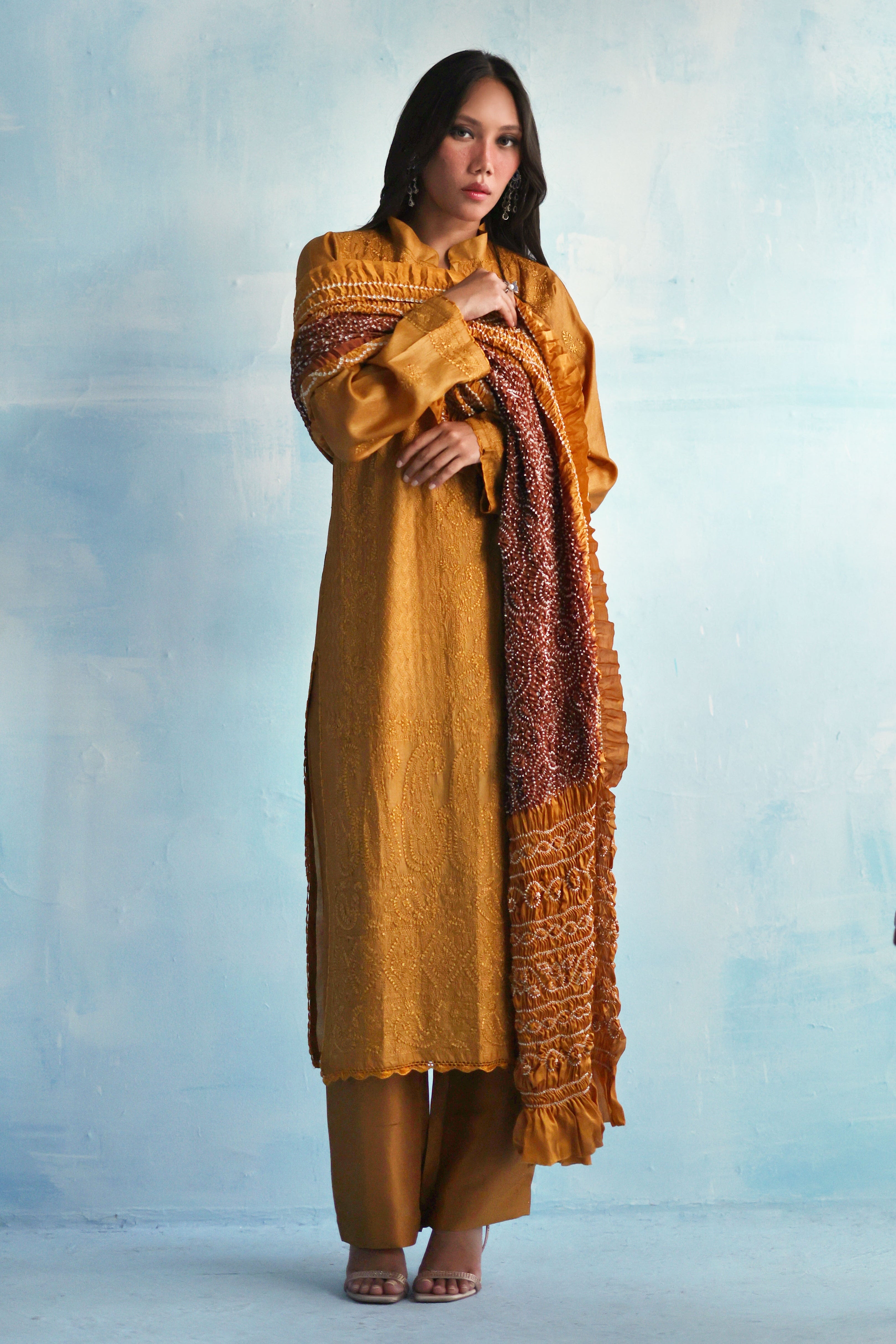 Rooted in tradition, yet made for now — our Mustard Chikankari kurta is paired with a rich Chundri dupatta, dyed in tones of deep coffee and golden ochre. An ensemble that brings colour, craft, and presence together effortlessly.