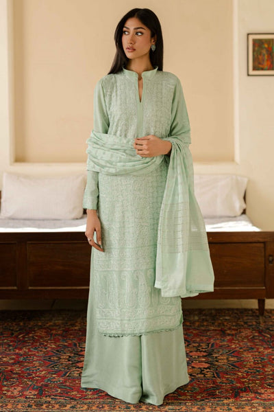 An aqua green Boski silk kurta featuring hand embroidered Chikankari, paired with a raw silk palazzo and a sheer hand woven silk dupatta. A timeless festive ensemble that blends traditional embroidery with elevated silk textures.