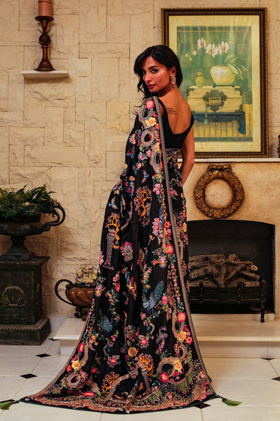 Black raw silk dupatta inspired by Mughal Baagh motifs, featuring delicate flowers, birds, vines and artistic figures. Adorned with fine multicolour hand embroidery, it reflects heritage craftsmanship and offers a regal, statement look.