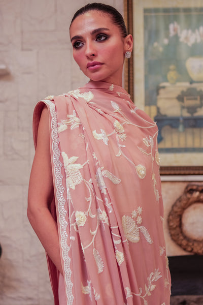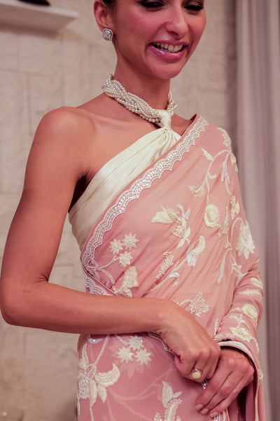 Tea pink and off-white floral saree is a fine example of delicate craftsmanship. The floral motifs are beautifully created with cut dana and sequins, adding a subtle shimmer to the design. The soft colour palette enhances its elegant and feminine appeal, making it perfect for festive and special occasions.