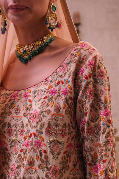 Elegant beige kashidakari embroidered shirt with delicate sequins, paired with a matching dupatta and maroon accents. Completed with a coordinating sharara, this classic suit is perfect for festive occasions and evening gatherings
