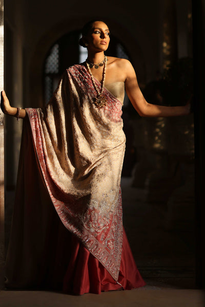 A 2.75-yard silk shawl in soft ivory and pink ombré, delicately embroidered in silver and ivory threads with geometric motifs and floral mehrab borders. Paired with a matching raw silk lehnga and choli — graceful, feminine, and timeless.