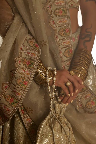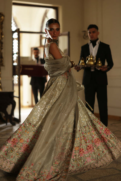 A pastel green raw silk lehenga adorned with intricate zardozi and cut daana embroidery in gold and silver, complemented by soft pink floral detailing. Paired with a 4.5-yard organza dupatta, it embodies feminine grace and timeless luxury.