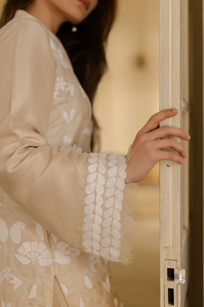 A floral Kantha shirt and izaar crafted in pure Tusser silk in a natural beige tone. Detailed with scalloped borders and delicate organza fray accents, this neutral ensemble reflects timeless Kantha craftsmanship and understated elegance.