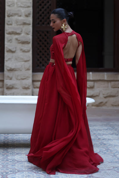 A contemporary formal crafted in chiffon, featuring a cut daana–embroidered choli with attached flowing cape sleeves. Paired with a plain chiffon lehenga finished with an embroidered cut daana waistband. Elegant movement and a rich deep red hue define this standout ensemble.