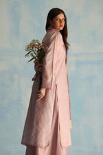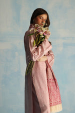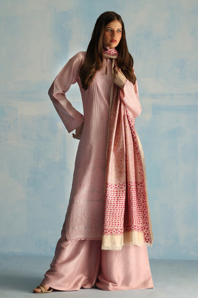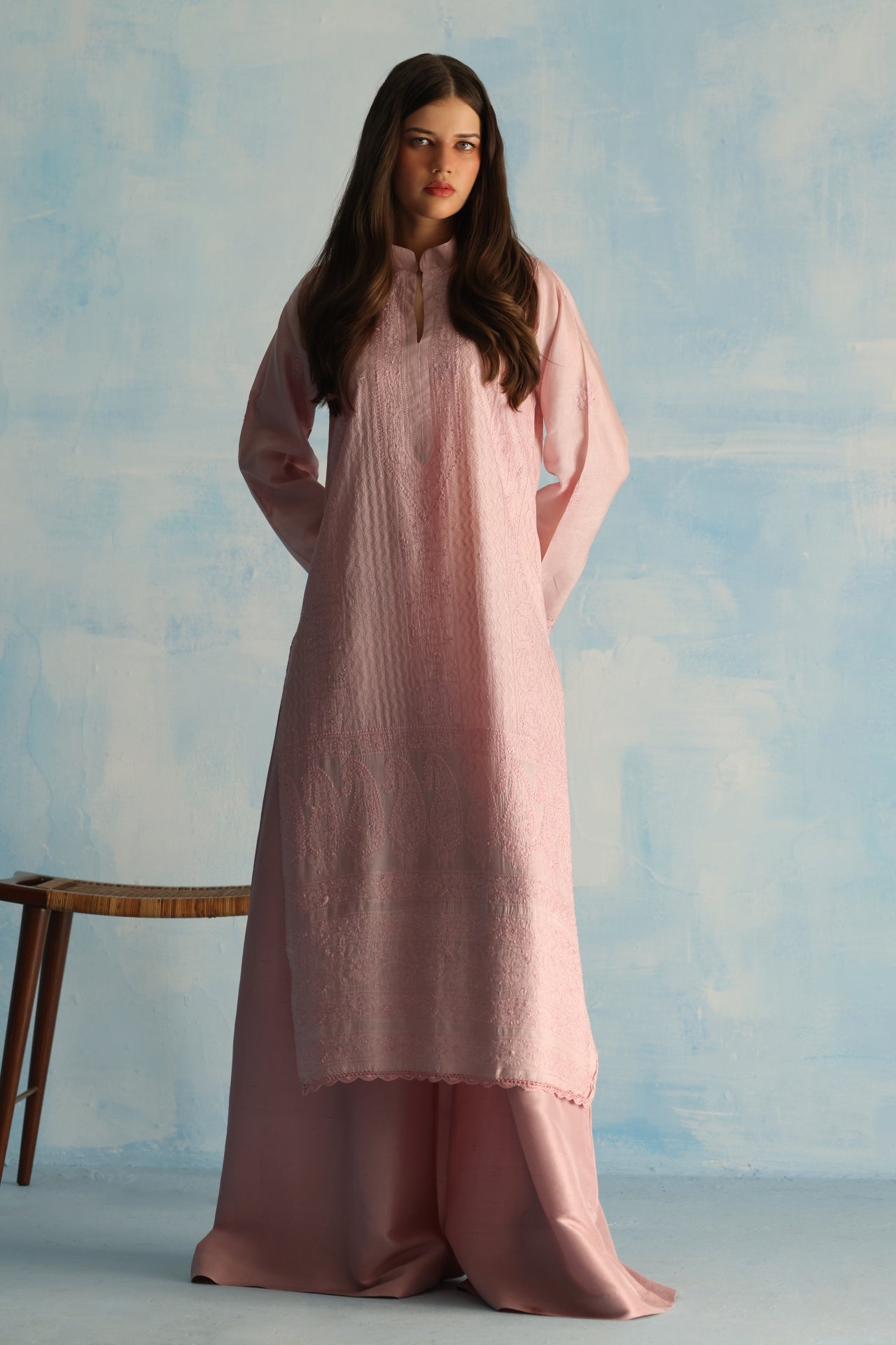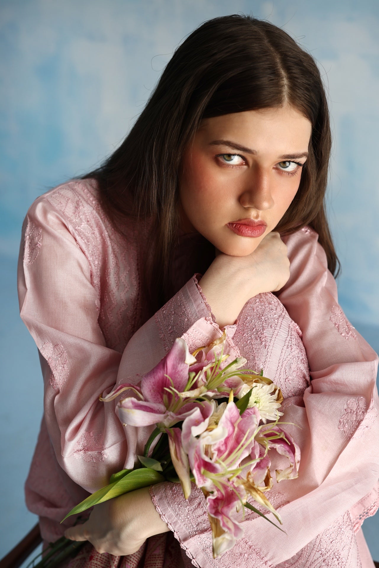 Soft as bloom, gentle as dusk. Our Orchid Pink Chikankari ensemble is rendered in Tusser and raw silk — paired with a delicately hand-embroidered Kantha dupatta in shades of blush and beige. A romantic, feminine classic.