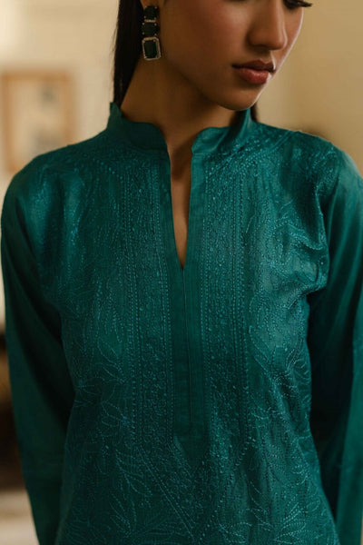 A teal Tusser silk Chikankari kurta with hand embroidered detailing, paired with a raw silk palazzo. A refined piece of Pakistani festive wear that blends traditional craftsmanship with timeless elegance.